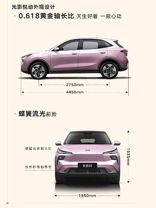 悦意03的车长4450mm,宽1850mm,高1635mm,轴距2750mm,这样的尺寸在同级别的车型中也是属于非常优秀的存在。同时悦意03还拥有着0.618黄金轴长比,这也让整车在视觉上显得更加的优雅。