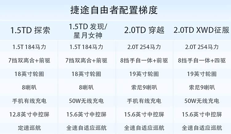 捷途自由者可以看做是山海T1的燃油版车型,山海T1作为混动车型,竟然是先出的,有点“电改油”的意思。捷途自由者采用1.5T和2.0T两款发动机,共推出5款车型,售价区间为12.49-15.49万元,权益价9.99-12.99万元。