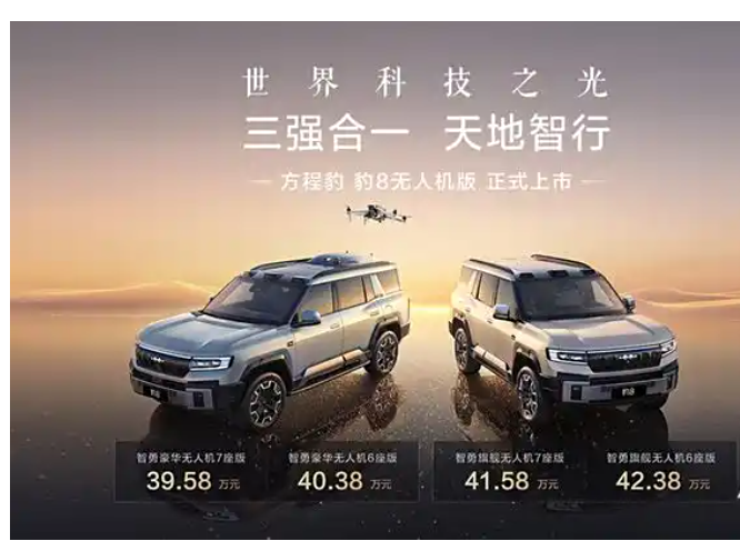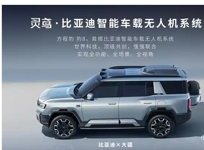 值得一提的是,方程豹豹8无人机版在车顶位置增加了车载无人机舱,并搭载了比亚迪与大疆联合研发的智能车载无人机系统,实现了全功能、全场景、全视角、低空联动车载无人机功能,为消费者带来了全新的智驾体验。