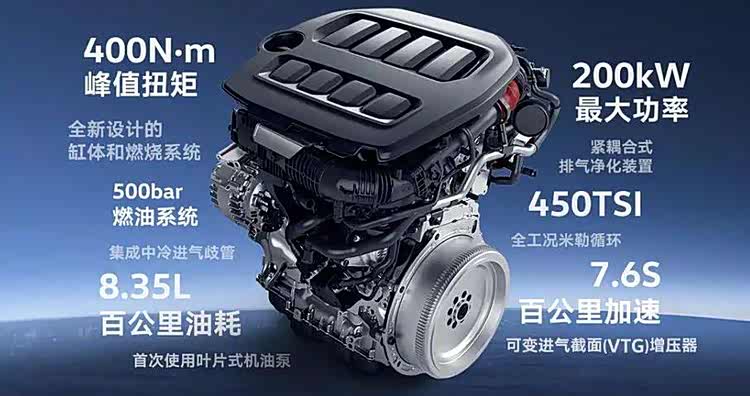 动力系统是途昂Pro的一大亮点。新车是国内首台搭载第五代EA888发动机(EA888 Evo5发动机)的车型。这台发动机搭载保时捷同源的可变截面涡轮增压器(VTG),能够更精确地控制增压气流的速度和流量。其最大功率为200kW,在1700转时即可爆发出400N·m的峰值扭矩。传动部分与之匹配的是7速湿式双离合变速箱。由于采用了全工况米勒循环以及加入了叶片式机油泵,新车的百公里综合油耗仅为8.35L/100km,百公里加速时间也缩短至7.6秒,这两项数据相较于现款途昂均有了显著提升。