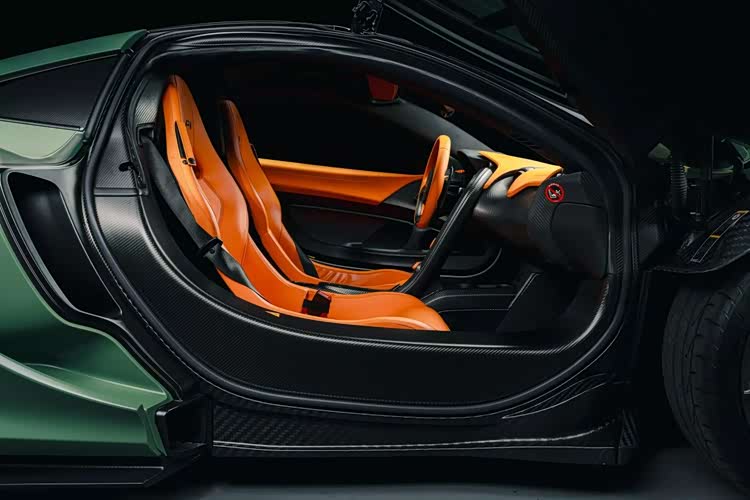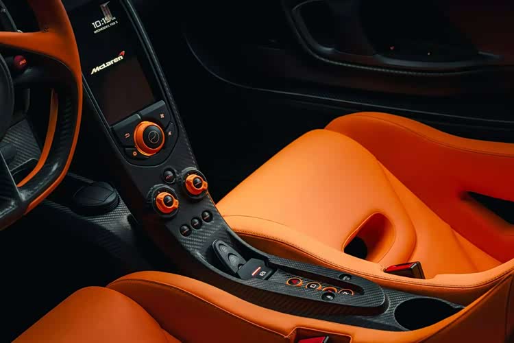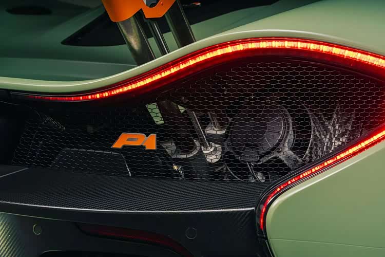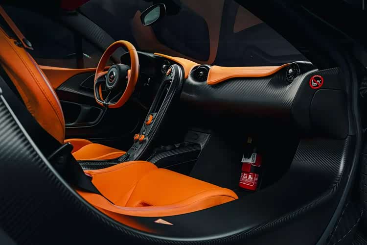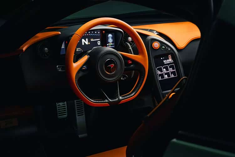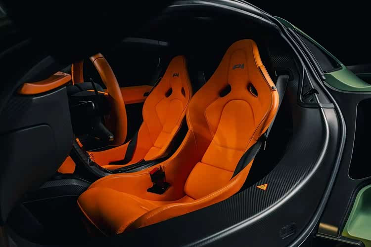 通过照片我们可以看到与绿色形成对比的是多处迈凯伦橙色细节,包括车标、刹车卡钳、轮毂中心盖以及 P1 标志。而且这些迈凯伦橙色装饰元素也延续到了车内,出现在座椅、方向盘和仪表盘上。