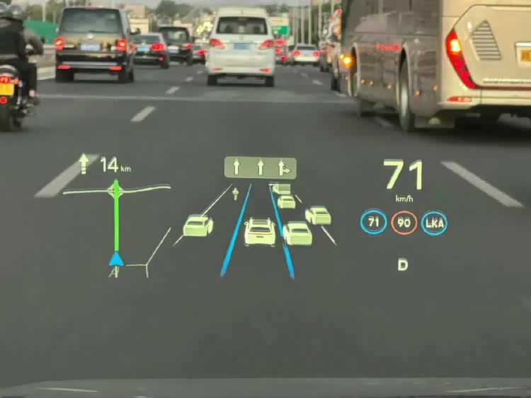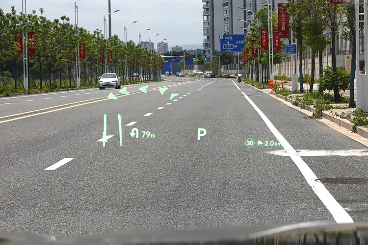 第三种可以说是 W-HUD的升级版 AR-HUD 增强现实式 HUD,它不仅能显示基本的车辆信息,还能利用增强现实技术,将虚拟信息与现实道路场景相结合。例如,在导航时,AR-HUD 可以将导航箭头直接投射到前方道路上,指示驾驶员应该行驶的方向;在驾驶辅助系统工作时,能直观地显示车辆与前方障碍物的距离等信息。不过成本就比较高了,毕竟需要大尺寸的投影面积的,才能实现和现实的路面结合起来。所以AR-HUD 搭载的车型就比较少,不过 深蓝S07(参数|询价) 和 问界M9都是配备了AR-HUD的 使用体验上还是很不错的。