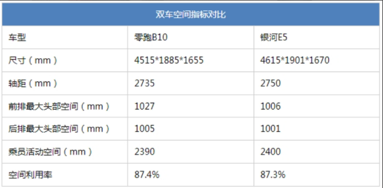 首先对比一下空间,可以看到零跑B10的空间利用率方面比起银河E5还要高一点点,这也使得它在尺寸比银河E5略小的情况下,做到在车内空间指标基本接近,甚至在前后排头部空间表现还比银河E5更好一点。