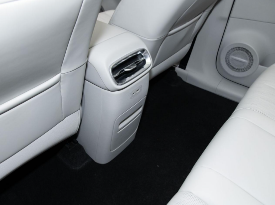 后排中控下方储物箱这里也做了个别出心裁的设计,留出的缝隙刚好适合往里面放纸巾当个纸抽,后排乘客可以直接从这个缝来抽取纸巾,非常方便。