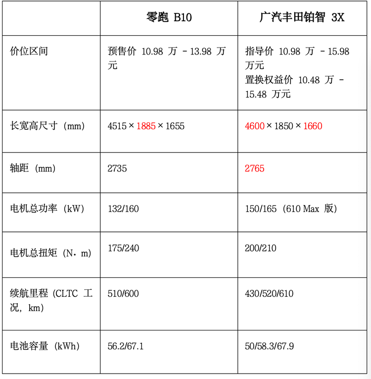 综合来看,零跑B10在整体价位较低的情况下,通过更先进的座舱芯片、特色的车机大模型融合以及独特的内饰拓展设计等,在性价比方面展现出自身的优势,特别是对于追求科技感和个性化的消费者来说更具吸引力。广汽丰田铂智3X则代表了合资车型在智驾领域的最高水平,凭借其品牌影响力和品质口碑,同样是非常优秀的选择。主要参数可以参考以下表格。