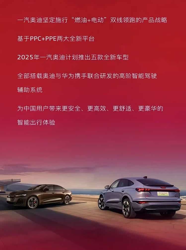 日前,一汽奥迪官方发布消息称,将坚持“燃油+电动”的产品战略,2025年将基于PPC+PPE两大全新平台推出5款全新车型,并且全部搭载与华为联合研发的高阶智能驾驶辅助系统。