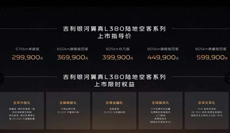 3月10日,吉利银河首款高端MPV——吉利银河翼真L380「陆地空客系列」在「东方好莱坞」横店影视城璀璨上市。新车共推出5个版型,官方指导价29.99万元-59.99万元,成为30万级最大最豪华的纯电MPV,开启“电混同价”新时代。