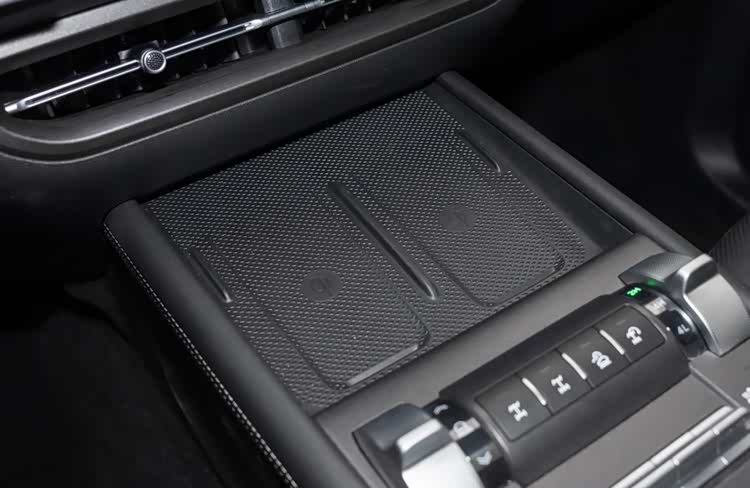 整个扶手台变得比较空旷,布置了双手机位,都带50W无线充电面板。