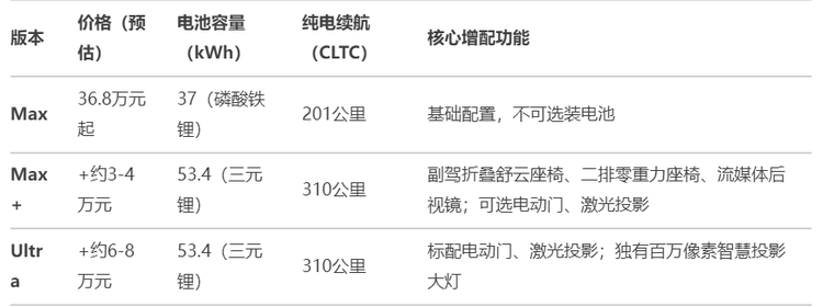 Max+版本在Max的基础上加价约3-4万元,电池容量升级至53.4kWh(三元锂),CLTC纯电续航提升至310公里,并新增副驾折叠舒云双享座椅(支持加热/通风/按摩)、二排零重力座椅(一键躺平)以及流媒体后视镜等配置;此外,还可选装电动门和激光投影(车内娱乐系统)。