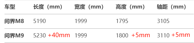 而M9则略大一些,长度为5230mm,宽度保持不变,高度为1800mm,轴距为3110mm。