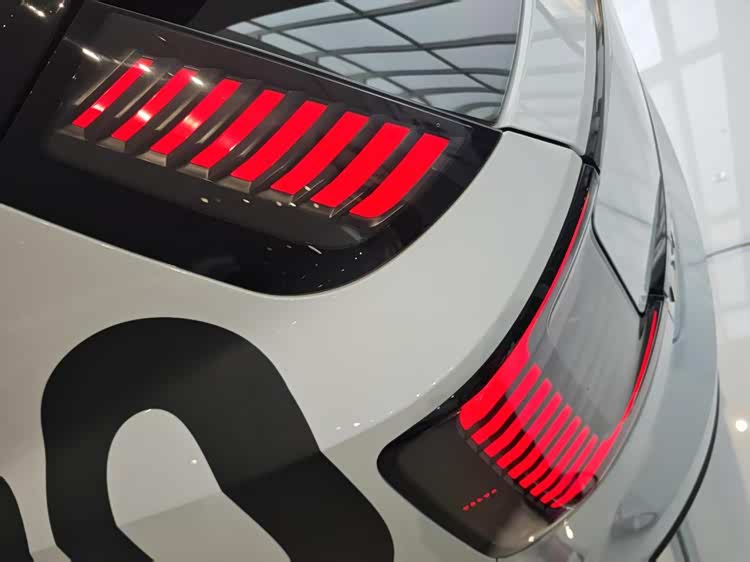 沃尔沃EX30车尾上方一个大尺寸尾翼中间镶嵌着高位刹车灯,往下沃尔沃字母车标搭配两侧家族化辨识度高的尾灯组,最下方采用大面积黑色包围贯穿,整个车尾尾灯点亮之后极具辨识度。