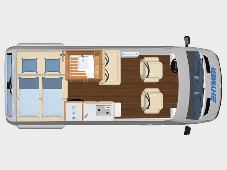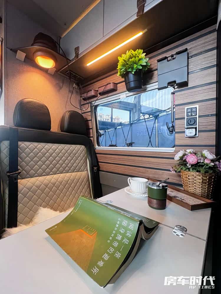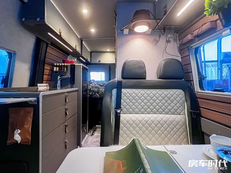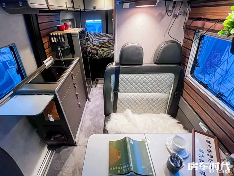车辆内饰的设计还是很具有欧洲风格的,尤其是侧边墙壁的设计采用了大面积木板作为装饰以及实用件,这其实在国产房车的设计里不那么常见,不过在笔者看来这倒是无所谓好坏之分,仅仅是风格的不同。整车内饰以灰色为主,简约大气,再加上上述说到的木板材的使用,增加贴近自然的亲近感,设计上笔者还是觉得比较好看的。车内的地板均采用绝缘地板,在车顶、驾驶室、后门及滑动门都做了更强的保温设计。