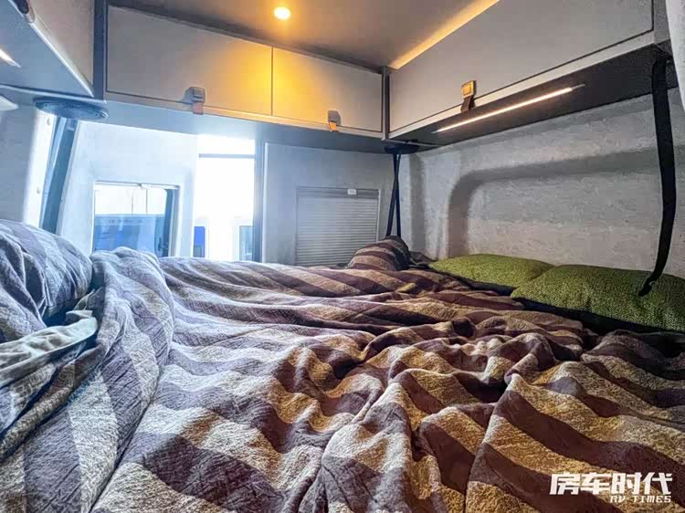 车尾的卧室区域尺寸为1350×1950mm,开头讲到的升顶床铺的尺寸为1220×2000mm,车内床铺的周围都做了优质隔热隔⾳织物层压材料,为睡眠提供一个舒适安静、温度适宜的环境。