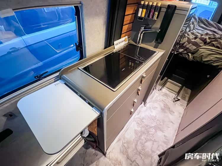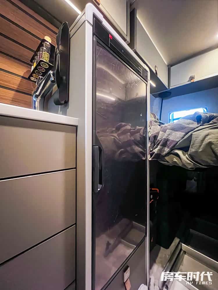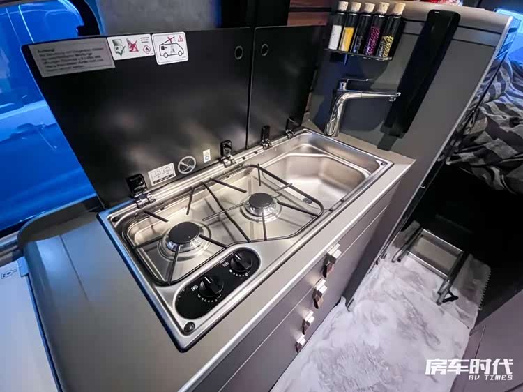 厨房区域的空间在B型车里应该算得上是比较大的了,而且配置上非常的齐全,不是有些B型车内部厨房仅配有洗菜池等简单配置的那种设计,这款车的厨房台面上方几乎被一整个带玻璃盖的烹饪盘组合所覆盖,这一配置其实在很多进口车型里是比较常见的,水槽的深度还是比较深的,这也能带来更多的实用价值。此外,灶台并不是国产房车常见的电磁炉,而是双头的燃烧器燃⽓灶,双头炉灶可以同时供两个锅使用,并且炉灶下方有接水盆与洗菜池直接相连,这样一来,如果遇到忘关火水烧开的情况,漫出来的水会直接流入洗菜池里,而烹饪时候产生飞溅出的油污等也更容易落下到接水盆里,这样一来直接水龙头冲洗即可,冲洗后的脏水也会自动流到洗菜池里排出,算是一定程度上做到了厨房区域的“干湿分离”。此外,厨房的侧面有可翻折的小桌板可以增加操作空间。厨房台面的下方有充足的抽屉,具有缓冲关闭功能,且抽屉内针对餐具划分,餐具可对应插⼊抽屉不易磕碰。厨房台面的后方有90 升压缩机冰箱,包括冷冻室,具有出⾊的冷却性能和安静的夜间模式。冰箱侧面有可放置调料、锅盖的架子。
