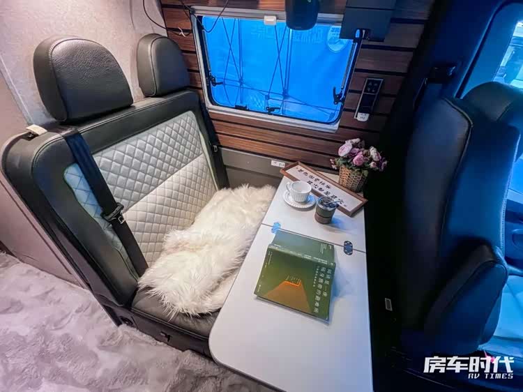 会客区的设计是B型车里较为常规的单排卡座设计,桌板可翻折,便于靠内的乘客进出,不用的时候收起还可释放过道空间,驾驶室的主副驾驶座椅都可以向后旋转,与单排卡座拼成可容纳4人的会客空间。会客区侧面上方有一排储物空间,在储物格的下方有暖黄色的氛围灯,与会客区置景配合很有氛围感。