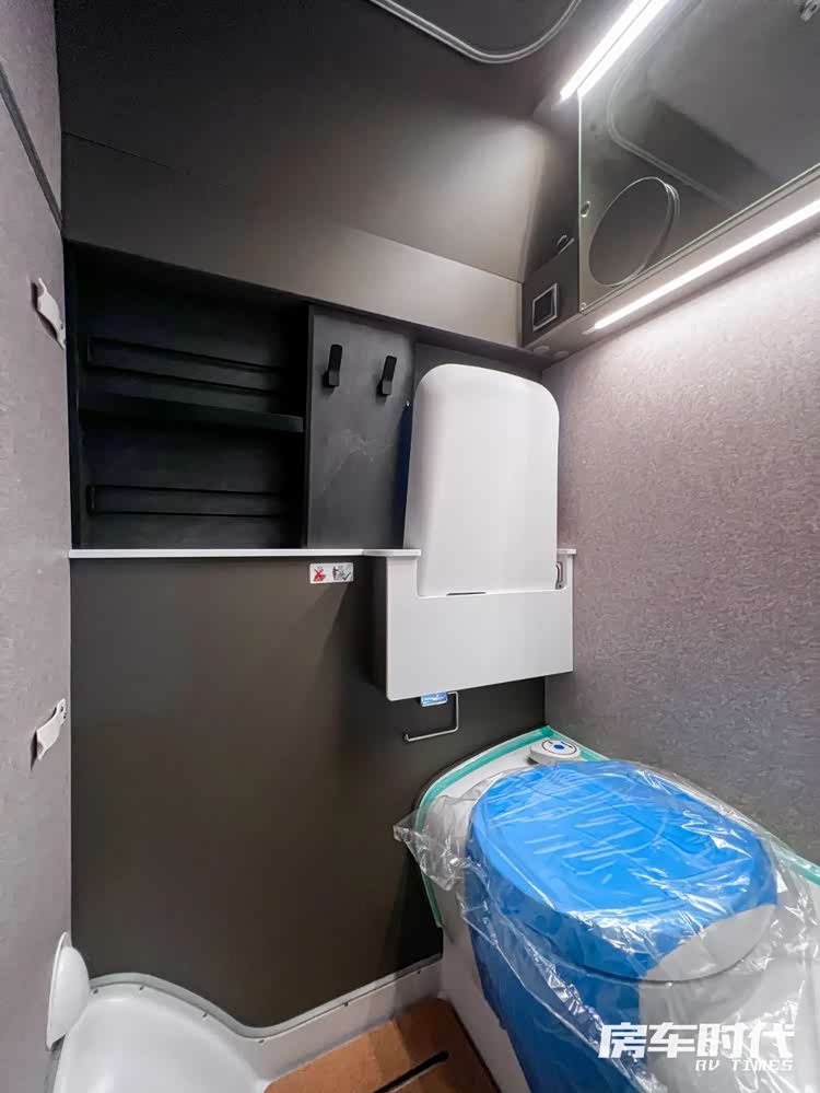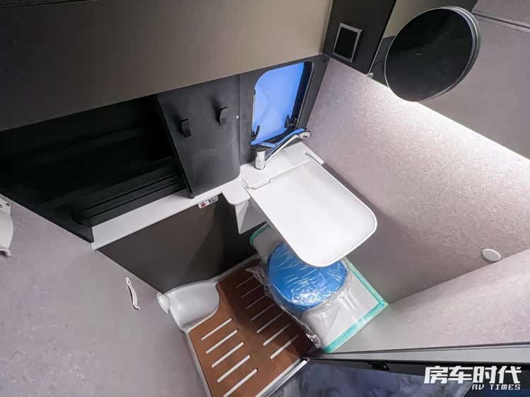 卫生间的空间在B型车里同样算是比较不错,内部配有带⽔位指⽰器的盒式⻢桶、带化妆镜的镜柜,侧边有可翻折的洗手池。地板采用隔栅设计,木质更亲肤,冬季也不会觉得冰凉。
