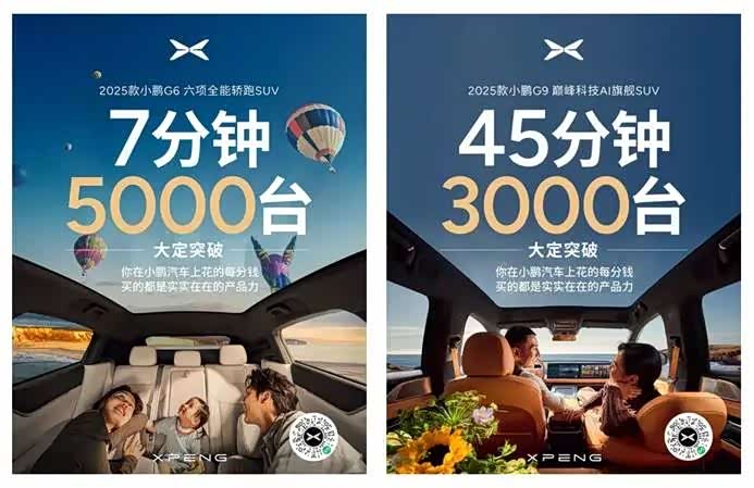 其中,2025款小鹏G6凭借7分钟斩获5000台大定订单的亮眼成绩,刷新行业纪录;定位更高端的G9同样表现不俗,45分钟内大定突破3000台,两款车型首日即掀起抢购热潮,印证消费者对小鹏智能化技术的高度认可。