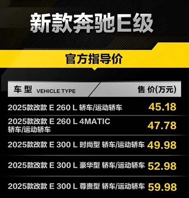 日前,北京奔驰旗下新车——2025款(改款) 奔驰E级(参数|询价)上市,提供10款配置车型,售价45.18-59.98万元。作为年度小改款车型,新车延续了老款车型的外观及内饰设计方案,同时在基础功能配置、动力系统、售价方面保持不变。另外,新车针对油耗、零百加速时间、车辆座整备质量进行了调整。