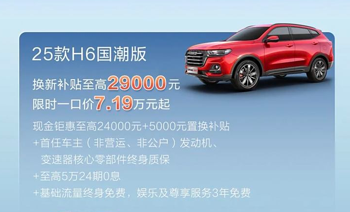 大家好,我是隔壁老王,今天咱们来聊聊2025款哈弗H6国潮版。最近哈弗SUV全系推出换新一口价购车优惠,限时优惠至高40000元,其中2025款哈弗H6国潮版限时一口价7.19万!这价格,真是让人心动啊!今天我就带大家详细看看这款车,顺便和长安CS75 PLUS做个对比,看看谁更值得入手。