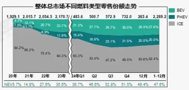 2024年新能源车渗透率跌回50%以下,主要原因在于纯电动车的增长乏力,份额无法维持。