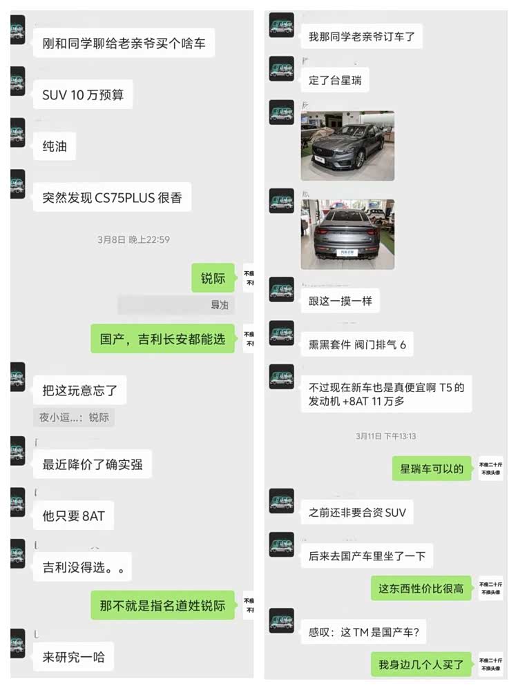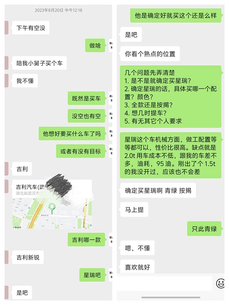 这些纯油车,或为家庭的第一台车,或为新能源车之外增购的家庭补充车辆。就在一个星期前,笔者就遇到个活生生的例子,如下图我们的聊天记录所示: