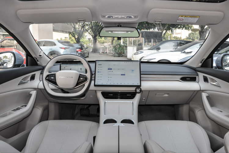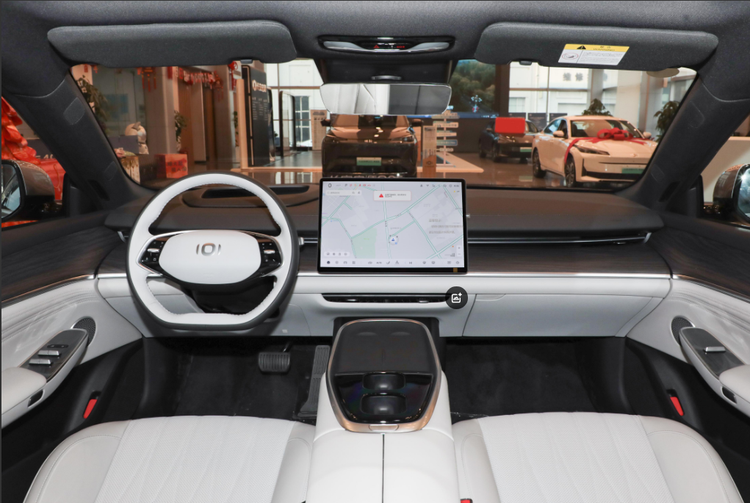 来到这款启源A07的车内,可以发现整个内饰设计也具有不错的豪华氛围感,而且科技氛围也不错。车内同样多采用了较多的软性材质覆盖,搭配上木纹饰板以及金属装饰条,档次感是有的,不过没有配备车内氛围灯。中控岛台采用了个性的双层设计,也配备了比较方便的手机无线充电面板。方向盘同样为双辐式平底设计,但没有配备方向盘加热。科技配置方面,这款车没有配备全液晶仪表,但是搭配了抬头显示系统(HUD),搭配15.4英寸中控屏幕,也具有不错的科技氛围。智能互联方面,支持导航、手机互联映射、OTA升级、语音识别控制等,没有配备面部识别和语音免唤醒功能。