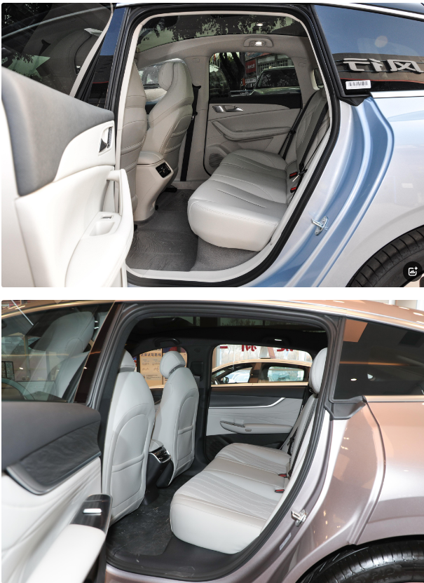说到空间之前,先说下两款车的车身尺寸。这款星海S7的车身长宽高分别为4935/1915/1495mm,轴距为2915mm;这款启源A07的车身长宽高分别为4905/1910/1480mm,轴距为2900mm,星海S7的整体车身尺寸略占优势,但两车相差不大。内部空间方面,我们以小编实测为例(小编身高175厘米,体重75公斤),主驾驶位调整至合适的驾驶坐姿。坐在星海S7车内时,主驾驶位的头部空间有一拳一拳半;来到对应的后排时头部空间有一拳一指,腿部空间接近三拳,这个空间表现在同级别车型中表现算不错的。接着来到启源A07的车内,坐在主驾驶位时头部空间有一拳半;来到对应的后排时头部空间有一拳,腿部空间有两拳三指左右,这个空间表现其实也不错。