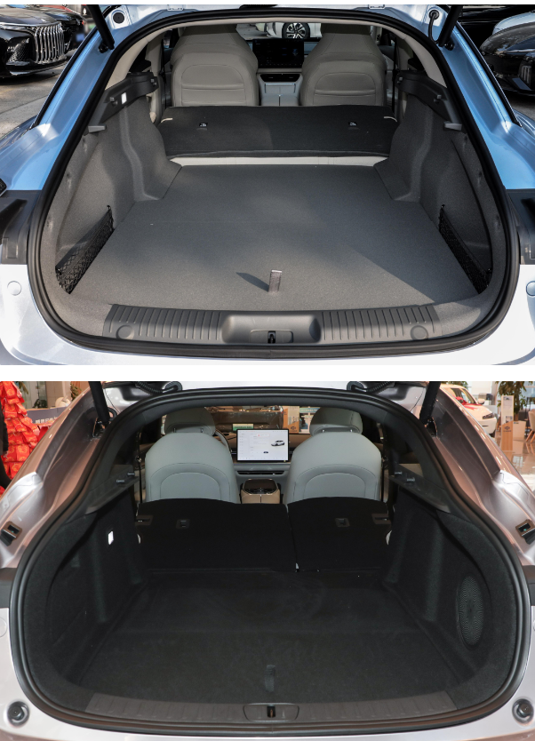 行李舱空间方面,两款车型的表现其实都不错。不过这款星海S7的常规容积和放倒后排座椅之后的容积都会更大一些,分别达到了541L和1303L,这个空间表现甚至要比很多SUV车型大一些。而且,星海S7的后尾门开口宽度达到了1047mm,高度最高可达1826mm,装载行李物品时会更加便利一些。这款启源A07的行李舱常规容积为475L,放倒后排座椅之后也可以得到1125L的容积,日常装载行李物品时也都是够用的。