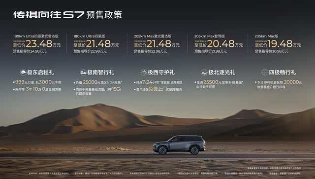 智电车讯认为,从传祺向往车系定义的“高阶”,不仅是产品本身透露出的“高阶”气质,更是一种引导追求品质生活、享受科技便利的生活理念。而作为传祺首款高阶智驾车型, 传祺向往S7(参数|询价)正式开启预售,国补后的预售价格仅需19.48万至23.48万元,并同步带来航空级的高阶礼遇,这也意味着,不到20万元就能轻松拥有。
