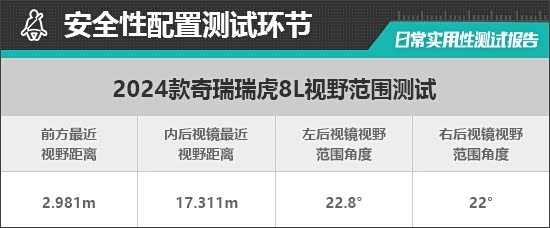 在车辆前、后方视野测试中,车内所有座椅均已调整至最低状态,所测出的数据与驾驶者正常使用时均有一些偏差,仅供参考。