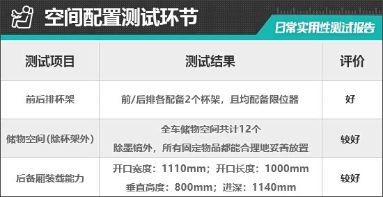 经过实测,评测车全车共计12个储物空间(不含杯架),上述固定物品除墨镜外,均具有合适的储物空间进行摆放,并且位置设计合理,拿取物品十分方便。
