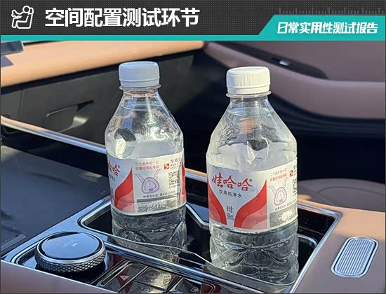 对于车内使用空间的测试,只针对前排触手可及的空间,不包括手套箱、中央扶手箱等需开启的空间。测试方法是将以下固定物品全部放置在前排的各个储物空间内,通过固定物品的放置情况来判断车辆储物空间的表现。测试选定的固定物品为:2瓶常规大小的矿泉水、1部大屏手机、1支口红、1个挎包、1副墨镜、1把折叠雨伞以及1包常规尺寸的抽纸。
