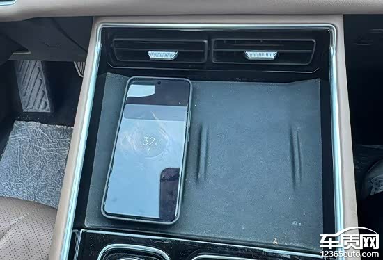 评测车在前排配备了1个50W手机无线充电板,位于仪表台下方,拿放手机十分便捷。并且充电功能可通过中控屏手动关闭,且具备散热功能,非常实用。