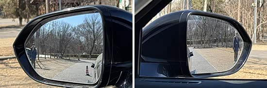 评测车的左/右外后视镜均采用了普通镜片,实测左外后视镜视野范围为22.8°,处于同级别下游水平;右外后视镜视野范围为22°,处于同级别上游水平。