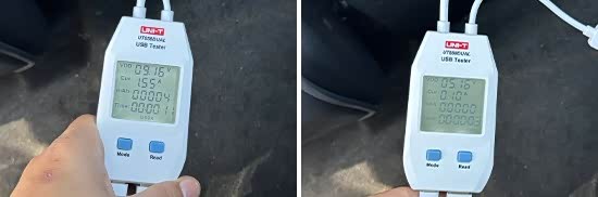 同时,我们对各个USB接口的电压与电流进行了测试,前排USB Type-C接口的最高电压和最高电流为8.23V和2.23A左右;USB Type-A接口的最高电压和最高电流为5.01V和0.87A左右。后排USB Type-C接口的最高电压和最高电流为9.16V和1.55A左右;USB Type-A接口的最高电压和最高电流为5.16V和0.1A左右,整体表现可圈可点。
