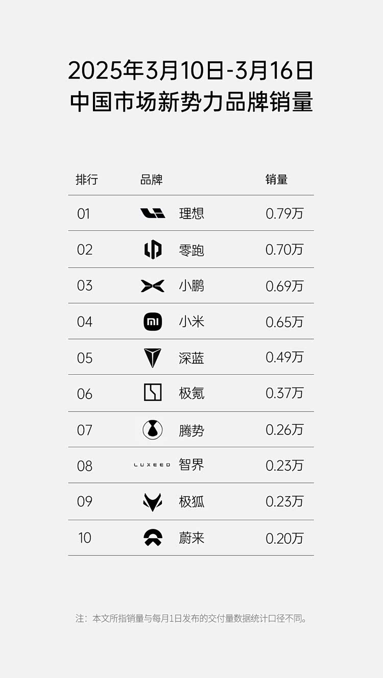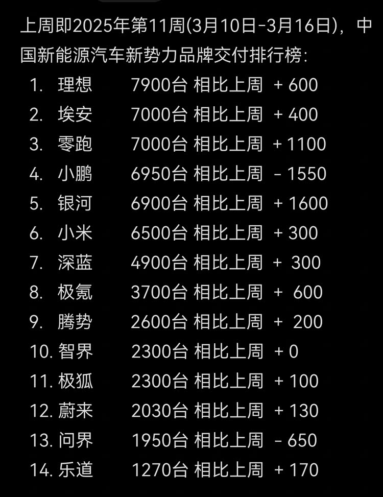 虽然中汽协号召车企不要发布周销量榜单,但在延迟一天之后,网上依然流传出了一份2025年第11周新势力销量榜单,同时还有一份更加全面的新能源车销量榜单。整体来看,理想汽车重新回到第一名,而问界则因为车型焕新周期的原因首次落到了十名之外。