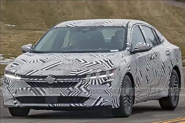 从外观谍照来看,新一代日产轩逸在外观设计上进行了大胆革新,采用了更为时尚、动感的设计语言。前脸部分,全新造型的分体式 LED 头灯组(上方为贯穿式灯带的搭配)犀利狭长,搭配熏黑分体式格栅,营造出强烈的视觉冲击力,整体设计风格与大众迈腾有几分相似,展现出大气稳重的气质。值得一提的是,前格栅内部疑似采用蜂窝式设计,并辅以熏黑装饰条点缀,在提升精致感的同时,也进一步强化了车辆的辨识度。