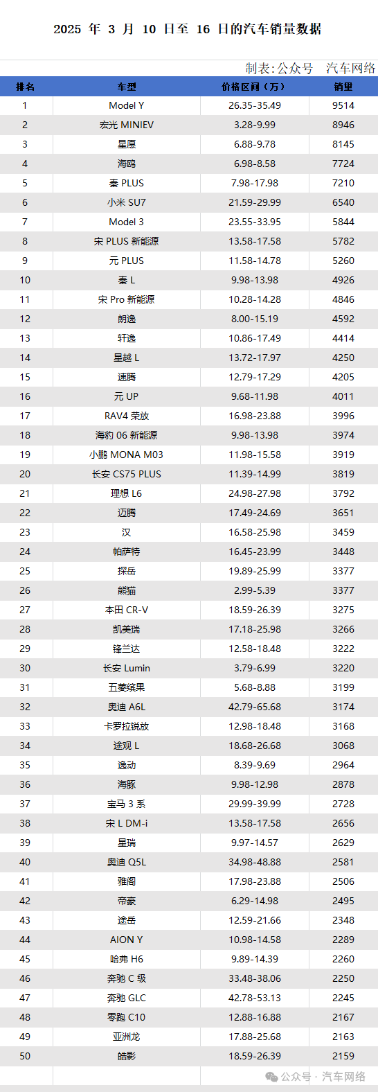 2025 年 3 月 10 日至 16 日的汽车销量数据显示,新能源车型持续领跑市场,传统燃油车加速分化。特斯拉 Model Y 以 9,514 辆夺冠,比亚迪海鸥(7,724 辆)、吉利星愿(8,145 辆)分列三四位,显示新能源市场头部效应显著。价格带呈现哑铃型分布:3-10 万元区间由宏光 MINIEV(8,946 辆)、长安 Lumin(3,220 辆)主导,满足短途代步需求;15-30 万元区间竞争激烈,秦 PLUS(7,210 辆)、宋 PLUS 新能源(5,782 辆)通过油电同价策略抢占市场;30 万元以上市场中,Model Y、奔驰 C 级(2,250 辆)、宝马 3 系(2,728 辆)形成差异化格局。
