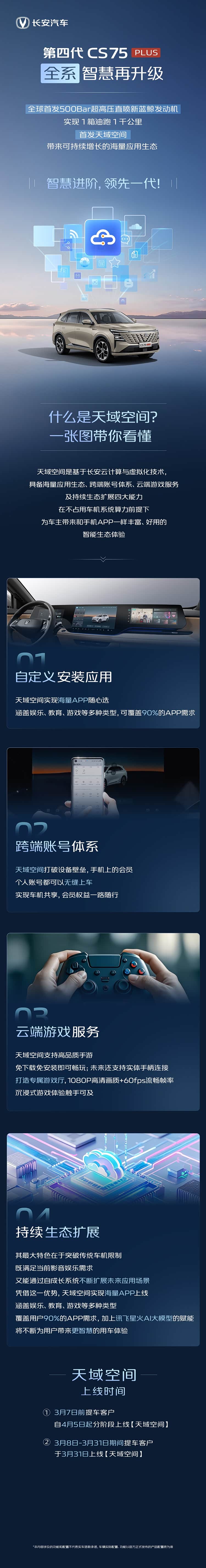 云端游戏服务是天域空间的另一大亮点。这个由长安联合华为、腾讯等科技巨头打造的智能座舱生态系统,不仅支持《原神》《崩坏3》等3A大作免下载畅玩,1080P/60帧画质媲美家用主机,而且无线投屏+多屏联动,PPT演示、视频会议都能在车内操作。此外,天域空间具备自成长持续更新的能力。系统将持续更新迭代,丰富 APP 数量,拓展开发新功能,如 AI 赋能、副驾屏协作等。3月8日起,购买鲸悦版的用户将率先体验天域空间的进化魅力。