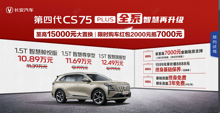 目前,长安 CS75 PLUS 1.5T 鲸悦版提供了最新政策权益。置换直降1万5+金融0利息,4S店销售都喊离谱。保养方面,1599 元即可享价值 8888 元的保养套餐,包含终身基础保养(含首保)。流量福利方面,基础流量终身免费,娱乐流量 3 年免费(4G/月)。特别是2000元抵7000元,限时红包一叠,裸车价压到10.89万起。