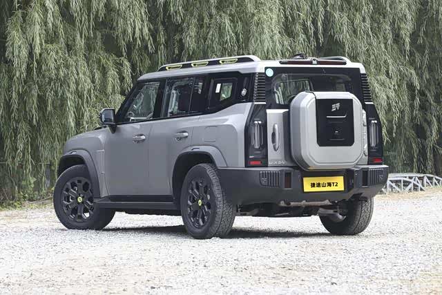 外观设计部分,捷途山海T2四驱荒野版延续了在售车型“方盒子”造型设计风格,其中前脸采用了方形前大灯组(配置自适应远近光源)+JETOUR光影格栅、造型硬朗的前包围组件(左右两侧配LED前雾灯);车身使用了传统造型机械式门把手、车窗外沿+前后轮眉(配轮眉灯)+侧裙等处熏黑装饰件、车顶行李架、固定式脚踏板;车尾使用了竖向布局尾灯组、侧开式后尾门(支持电吸)、外挂式备胎包、硬朗造型后包围组件+拖车钩等设计方案。