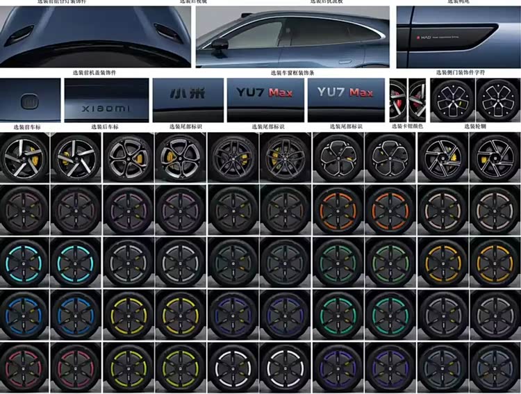 详细描述,小米YU7的碳纤维部件选择范围覆盖了前灯组、后视镜、扰流板、鸭尾翼以及发动机盖的开孔等核心部分。通过加入这些碳纤维组件,不仅可以显著降低车辆的整体重量和性能,还能为车辆带来更具活力和时尚感的外观设计。除此之外,小米YU7还向消费者提供了多达20种不同颜色的低风阻轮毂选择,包括紫色、白色、蓝色、绿色和红色等多个色系,以充分满足消费者对车辆外观个性化的需求。