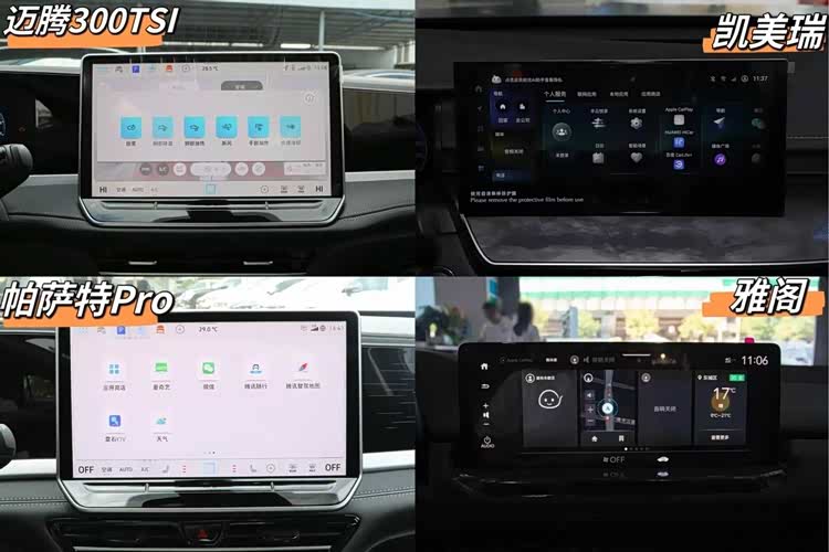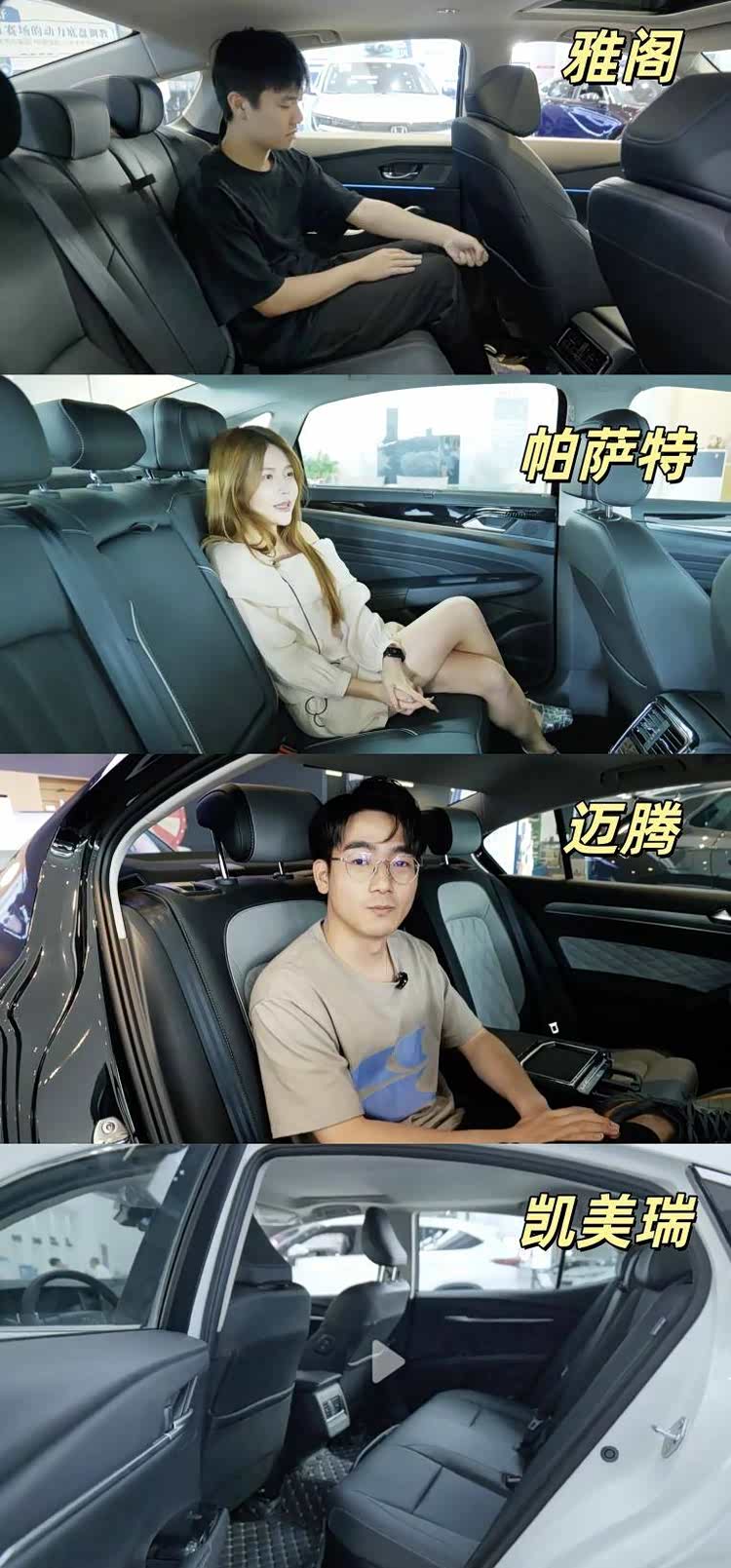 迈腾则多了腿托调节、14个喇叭的哈曼卡顿音响;而帕萨特Pro后排有通风、按摩等功能可选,以及16个扬声器哈曼卡顿音响,二排老板键等。当然价格层次也更高一些,整体来说,日常家用的话,凯美瑞/雅阁都足够用,商务接待可以考虑上迈腾、帕萨特。