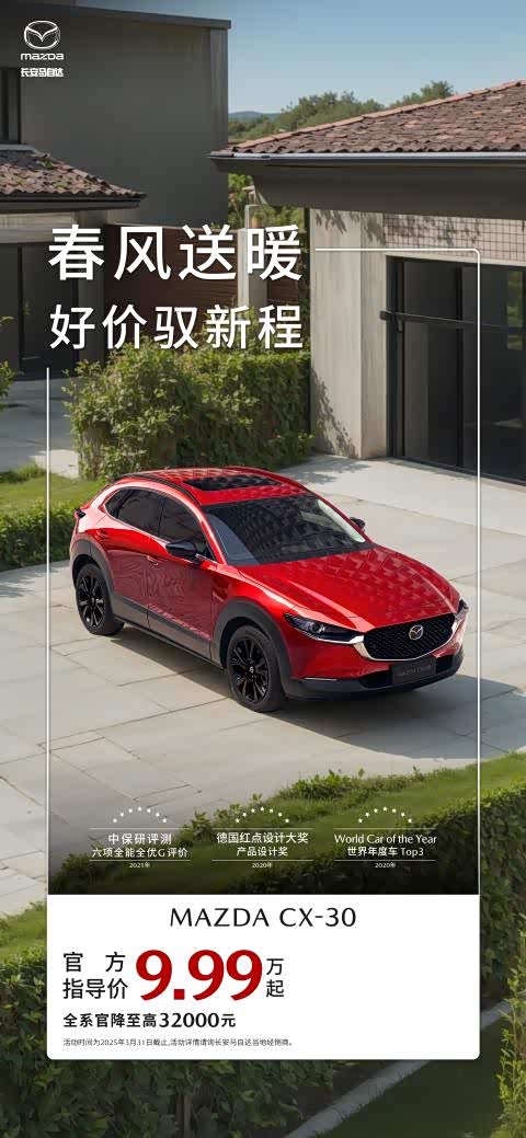 作为备受广大都市女性用户青睐的时尚座驾,MAZDA CX-30在惊艳的「魂动」设计下,同样也获得了中保研(C-IASI)全优「G」优秀评价。MAZDA CX-30和次世代MAZDA3昂克赛拉均诞生于全新世代「创驰蓝天」车辆架构平台,安全性能不分伯仲。其中,MAZDA CX-30的车顶载荷质量比更是达到6.37。国家相关要求标准为车辆顶部在承受2,062.5Kg的力度下不能发生变形,但CX-30车顶最大承受力达到了惊人的8,758.75kg,是国标要求1.5倍整备质量的4倍之多,车身强悍性能可见一斑。目前,MAZDA CX-30至高优惠32,000元,全系车型9.99万起。