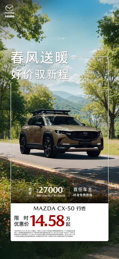 MAZDA CX-50行也获得了中国保险汽车安全指数(C-IASI)7项“G”优秀评价。值得一提的是,在C-IASI的碰撞测试中,MAZDA CX-50行也是同批次9款车型中唯一申请“乘员侧正面25%偏置碰撞”的车型,车辆双A柱碰撞表现均获得了最高“G”优秀评价。CX-50行也车身高强度钢材占比达到58.59%,同级别最高。前后防撞梁在采用1,800MPa热成型钢的基础上,前防撞梁再增加一个硬度为1,180MPa的强化构件,打造史上最强防撞梁。车顶承重峰值超过10吨,内置66升超大侧气帘,比同级别车型容积大3倍,实现车窗保护覆盖率百分百。全系标配7个大型安全气囊,能够为车内乘员提供全方位、无死角的安全防护。目前,MAZDA CX-50行也限时优惠价14.58万起,符合条件的用户置换购车至高可享12,000元厂补和15,000元国补,首任车主享终身免费质保。