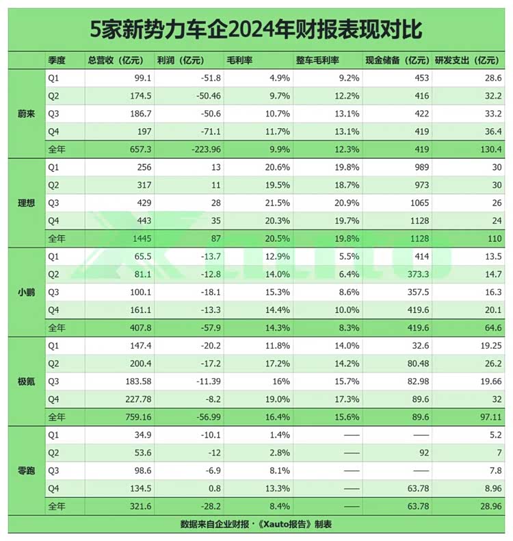 进入3月,蔚来、小鹏、理想、零跑、极氪五家成功上市的造车新势力陆续发布2024年度财报。