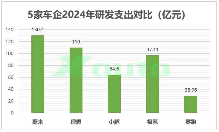 蔚来汽车全年研发投入为130亿元,为5家车企中最高。期末现金储备为419亿元,与小鹏汽车持平。