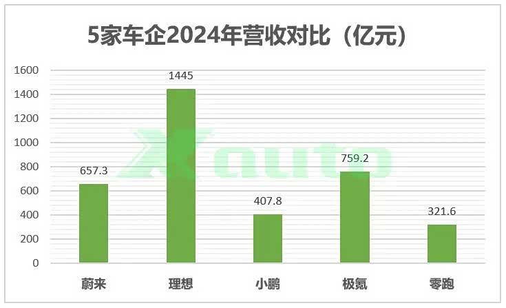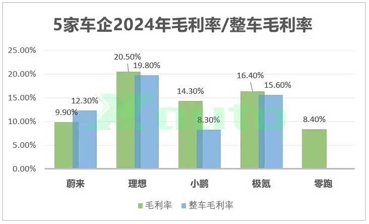 在5家企业中,理想最赚,全年营收1445亿元,也是唯一一家实现盈利的车企,净利润达到87亿元,毛利率及整车毛利率均在20%左右,2024年全年研发投入为110亿元,在5家车企中位列第二。
