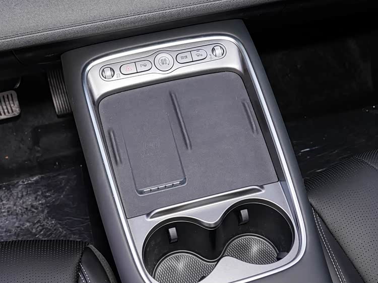 前排标配50W无线充电,这个非常实用,另外一个泊位适合不需要充电时放置手机,设计的巧妙合理。还带有一排非常清晰明了的实体按键,后面是贯通式双杯架和储物格,顶配车型还有冷暖冰箱,支持-6到+50℃的调节。