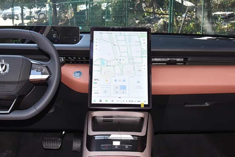长安逸动 PHEV 2025 款内饰采用对称式布局,中控台通过分层设计提升视觉层次感。10.25 英寸全液晶仪表与 13.2 英寸悬浮式中控屏形成双联屏组合(中高配车型),屏幕分辨率达到 1920×720,操作流畅度处于同级主流水平。车机内置导航、语音交互(支持双区唤醒)及华为 HiCar/Carlink 互联功能,实体按键保留空调控制旋钮及部分常用功能键,兼顾操作便利性。